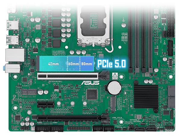 PCIe 5.0 nabĂzĂ dvojnásobnou rychlost pĹ™enosu dat oproti PCIe 4.0, takĹľe je dostateÄŤnÄ› robustnĂ, aby zvládla novĂ© Ăşlohy s velkĂ˝m objemem dat. PCIe 5.0 pĹ™inášà i dalšà vĂ˝hody, jako jsou elektrickĂ© zmÄ›ny pro zlepšenĂ integrity signálu, zpÄ›tnÄ› kompatibilnĂ konektory CEM pro pĹ™ĂdavnĂ© karty a zpÄ›tná kompatibilita s pĹ™edchozĂmi verzemi PCI Express. SafeSlot je zesĂlenĂ˝ kovovĂ˝ plášť pĹ™idanĂ˝ do slotu PCIe, kterĂ˝ zajišťuje pevnou instalaci karty.