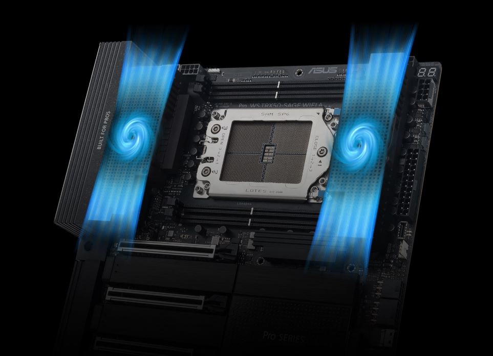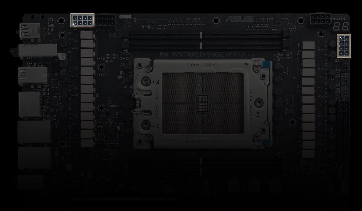 Sestava modulu regulátoru napÄ›tĂ Pro WS TRX50-SAGE WIFI A se skládá z 20+3+3+3 napájecĂch fázĂ, kterĂ© poskytujĂ vĂ˝kon a účinnost, kterou nejnovÄ›jšà procesory AMD Ryzen™ vyĹľadujĂ, a stabilitu pro extrĂ©mnĂ pĹ™etaktovánĂ.