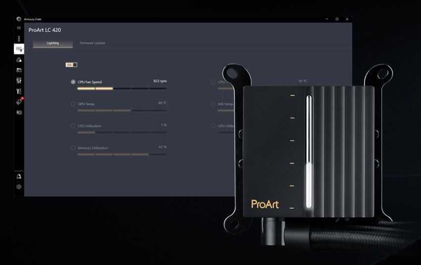 Pro překonání tepelných problémů nejnovějších vícejádrových CPU nabízí ProArt LC 360 ventilátory chladiče Alphacool Apex Stealth Metal 120 mm, které poskytují vysoký výkon a minimalizují hluk.