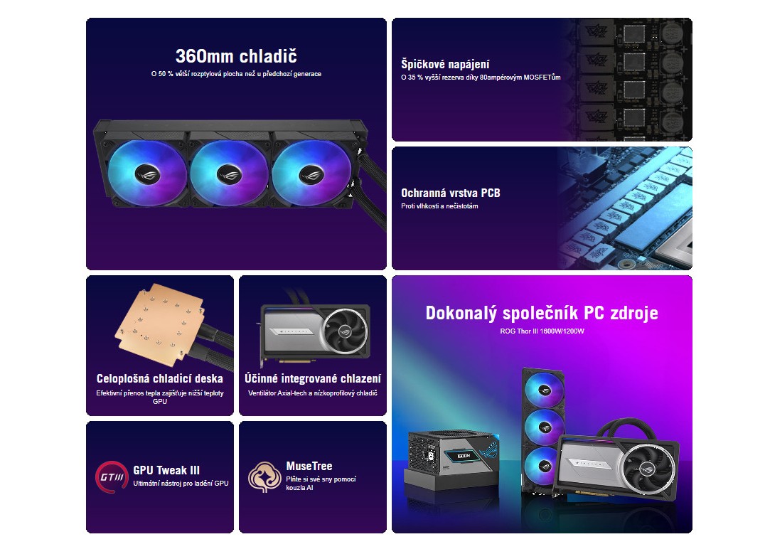 Nová Ĺ™ada karet ROG Astral byla inspirována neomezenĂ˝m prostorem a krásou vesmĂru. Je dĹŻkazem nekoneÄŤnĂ©ho odhodlánĂ objevovat a definovat novĂ© hranice. ROG Astral LC GeForce RTX 5090 pĹ™inášà špiÄŤkovĂ˝ chladicĂ vĂ˝kon dĂky prĂ©miovĂ©mu 360mm AIO chladiÄŤi, celoplošnĂ© mÄ›dÄ›nĂ© desce a integrovanĂ©mu ventilátoru. VĂ˝konnĂ© 80ampĂ©rovĂ© tranzistory MOSFET navĂc poskytujĂ vysokĂ˝ potenciál pro pĹ™etaktovánĂ pĹ™i zachovánĂ tichĂ©ho provozu.