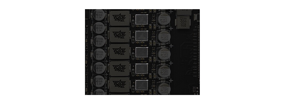 Výkonné 50ampérové tranzistory MOSFET s dalšími napájecími fázemi poskytují o více než 25 % vyšší rezervu ve srovnání s referenčním řešením. To pomáhá zajistit vyšší výkon, stabilitu a vyšší potenciál pro přetaktování.