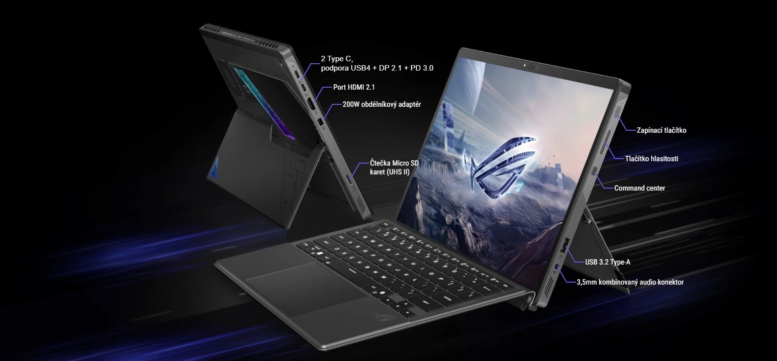 Navzdory tenkĂ©mu profilu je Flow Z13 schopen vytvoĹ™it z vašà sestavy opravdovou bojovou základnu. Dva porty USB Type-C s podporou USB4, obrazovĂ˝ vĂ˝stup DisplayPort 2.1 a napájenĂ Power Delivery 3.0 umoĹľĹujĂ bezproblĂ©movĂ© pĹ™ipojenĂ k celĂ© Ĺ™adÄ› monitorĹŻ a perifernĂch zaĹ™ĂzenĂ. Z13 je takĂ© vybaven klávesou Command Center, jednĂm portem USB-A, HDMI 2.1, ÄŤteÄŤkou Micro SD karet a audio konektorem. DĂky tÄ›mto speciálnĂm vstupnĂm a vĂ˝stupnĂm portĹŻm je Flow Z13 jedinĂ˝m tabletem, kterĂ˝ vám opravdu umoĹľnĂ zcela zapomenout na dongly.