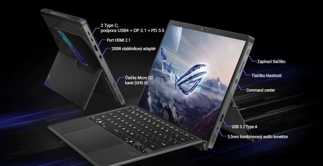 Navzdory tenkĂ©mu profilu je Flow Z13 schopen vytvoĹ™it z vašà sestavy opravdovou bojovou základnu. Dva porty USB Type-C s podporou USB4, obrazovĂ˝ vĂ˝stup DisplayPort 2.1 a napájenĂ Power Delivery 3.0 umoĹľĹujĂ bezproblĂ©movĂ© pĹ™ipojenĂ k celĂ© Ĺ™adÄ› monitorĹŻ a perifernĂch zaĹ™ĂzenĂ. Z13 je takĂ© vybaven klávesou Command Center, jednĂm portem USB-A, HDMI 2.1, ÄŤteÄŤkou Micro SD karet a audio konektorem. DĂky tÄ›mto speciálnĂm vstupnĂm a vĂ˝stupnĂm portĹŻm je Flow Z13 jedinĂ˝m tabletem, kterĂ˝ vám opravdu umoĹľnĂ zcela zapomenout na dongly.