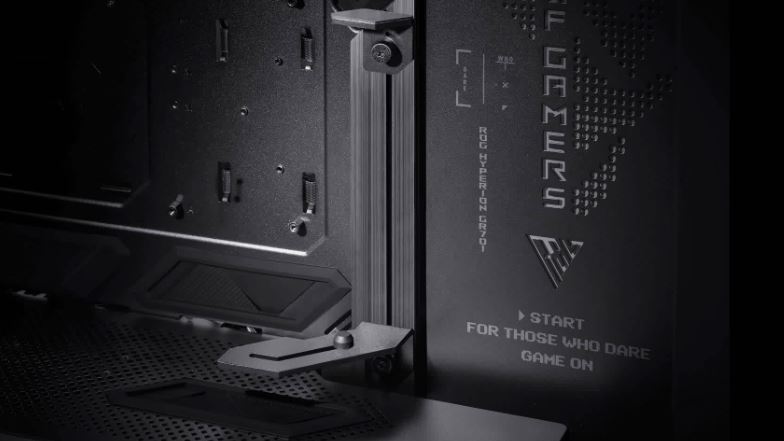 Skříň ROG Hyperion GR701 je vybavena vysoce propracovaným integrovaným držákem grafických karet, jehož lehké komponenty z eloxovaného hliníku lze použít vertikálně nebo horizontálně, aby se dlouhé grafické karty neprohýbaly, a nabízí další kompatibilitu s držákem karet ROG Herculx.
