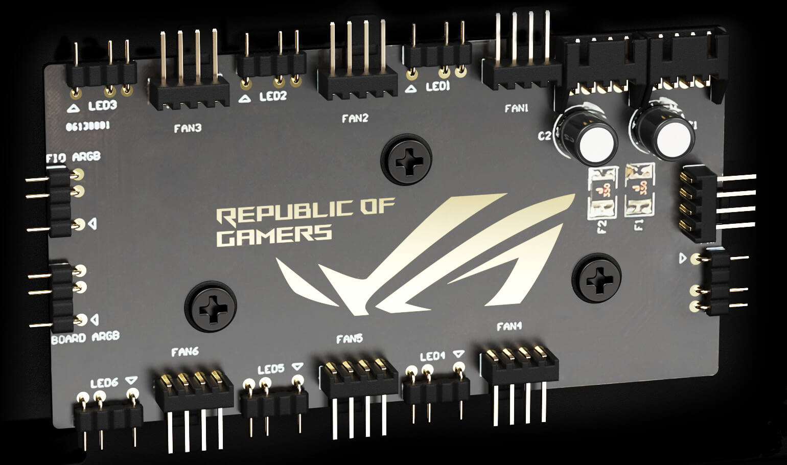 Žádné šasi ROG dnes není kompletní bez integrovaného rozbočovače pro ovládání ventilátorů a ARGB podsvícení. Tento je ozdoben zlatým logem ROG a podporuje až osm ARGB komponent a šest PWM ventilátorů, takže si uživatelé mohou kromě desky a čtyř již připojených ventilátorů skříně přidat i vlastní osvětlení a chlazení.