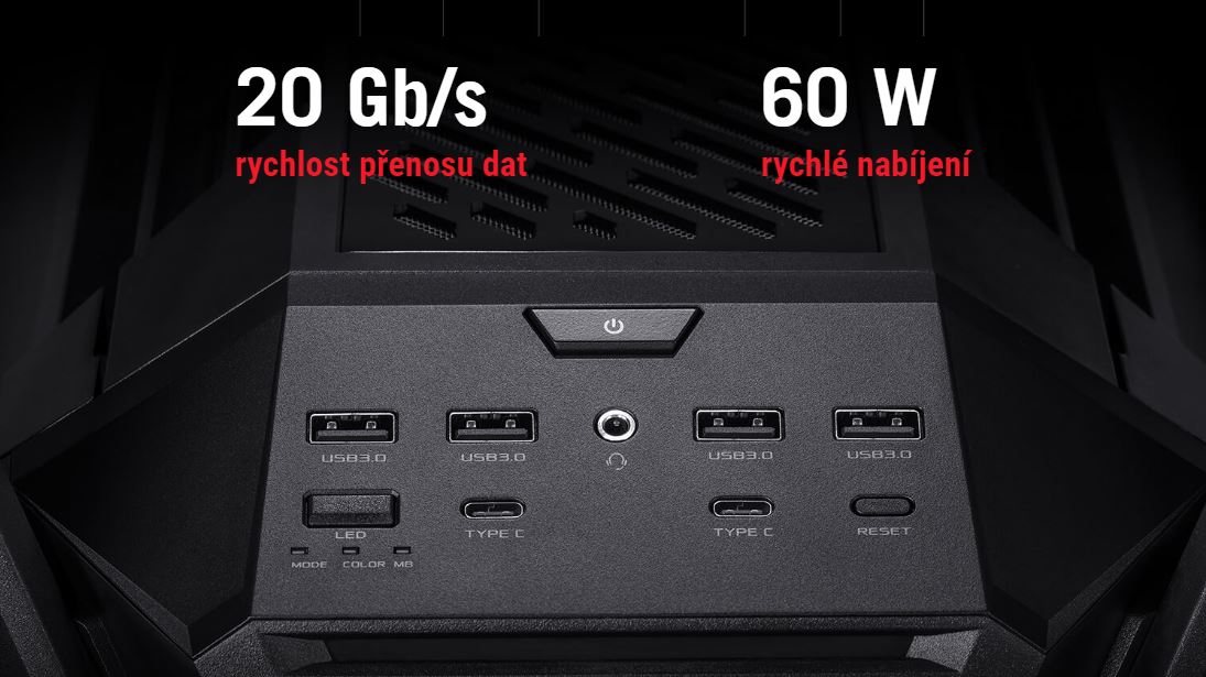 Přední strana každého šasi ROG musí nabízet řadu konektorů a ROG Hyperion k této tradici přidává dva konektory USB Type-C®, které mohou s kompatibilní základní deskou nabídnout přenos dat rychlostí až 20 Gb/s a rychlé nabíjení s výkonem až 60 W.