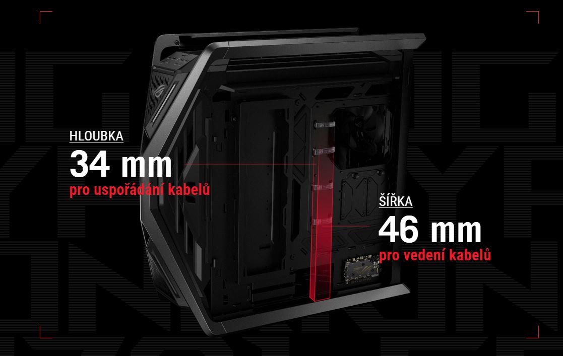 Pod roštem na základní desku najdou stavitelé 34 mm hlubokou komoru pro uspořádání kabelů a 46mm široký kanál pro vedení kabelů, který je zajištěn několika páskami na suchý zip se značkou ROG, aby za průhledným bočním panelem vypadalo vše efektně. Tato skříň také nabízí průsvitný kryt kabelů, který může zakrýt nevzhlednou kabeláž a zároveň nechat vyniknout vašemu RGB stylu.