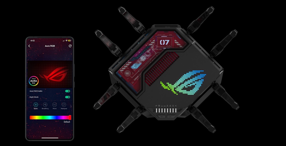 ROG Rapture GT-BE19000 nabízí přizpůsobitelné barvy a světelné efekty, které uživatelům umožňují vytvořit stylovou atmosféru. Tyto efekty lze snadno nastavit prostřednictvím webového grafického rozhraní nebo aplikace ASUS pro router. Nový exkluzivní noční režim navíc poskytuje útulnou atmosféru před spaním.