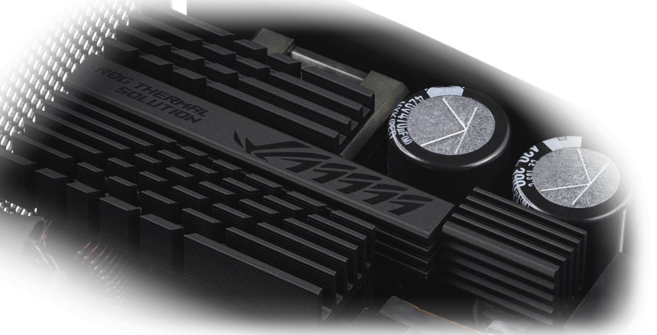 - Velké chladiče ROG pokrývají kritické komponenty a přinášejí nižší teploty a hluk než referenční návrhy.