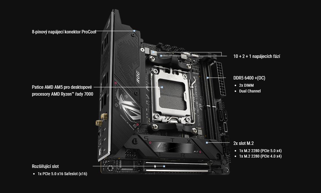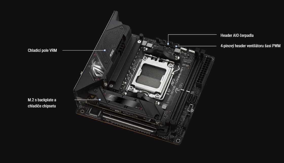 Aby model ROG Strix B650E-I dokázal drĹľet krok s vÄ›tšĂmi deskami, je vybaven silnĂ˝m napájenĂm a tichĂ˝m chladicĂm polem, coĹľ mu dává pÄ›knou rezervu pro dosahovánĂ vyššĂch frekvencĂ. TĂm však rychlost nekonÄŤĂ: paměť, grafickĂ© karty a ĂşloĹľištÄ› mohou bĂ˝t dĂky podpoĹ™e DDR5 a PCIe 5.0 vytĂĹľeny na maximum.