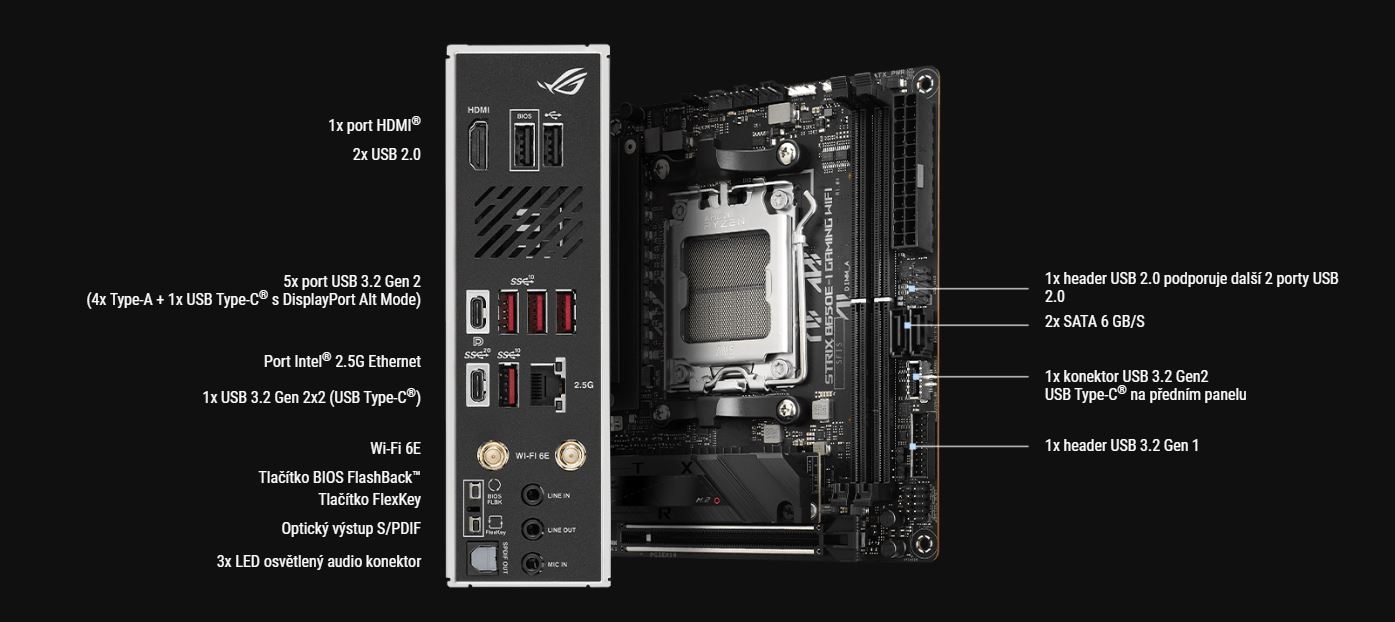 Navzdory malĂ˝m rozmÄ›rĹŻm se deska Strix B650E-I vyznaÄŤuje vĂ˝bornou konektivitou, neboĹĄ nabĂzĂ vĂce neĹľ gigabitovĂ© fixnĂ a bezdrátovĂ© sĂĹĄovĂ© pĹ™ipojenĂ a gigantickou kvalitu zvuku dĂky vylepšenĂ©mu Ĺ™ešenĂ SupremeFX.