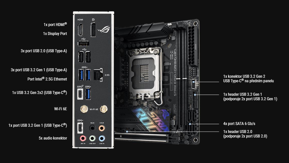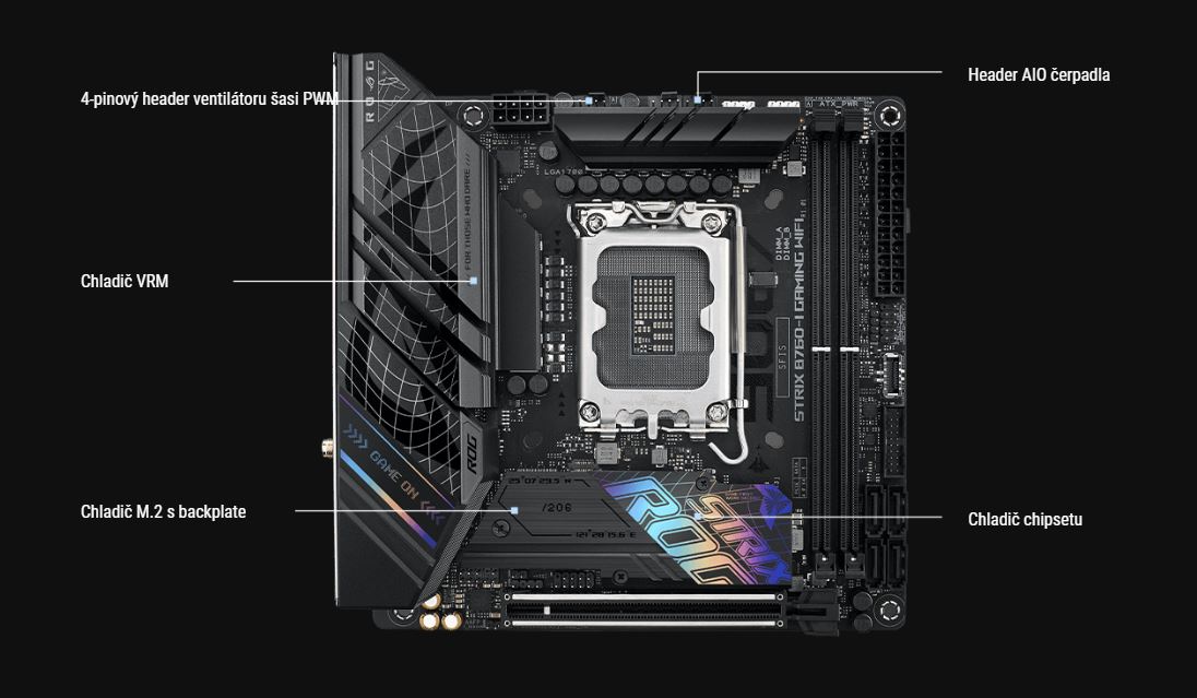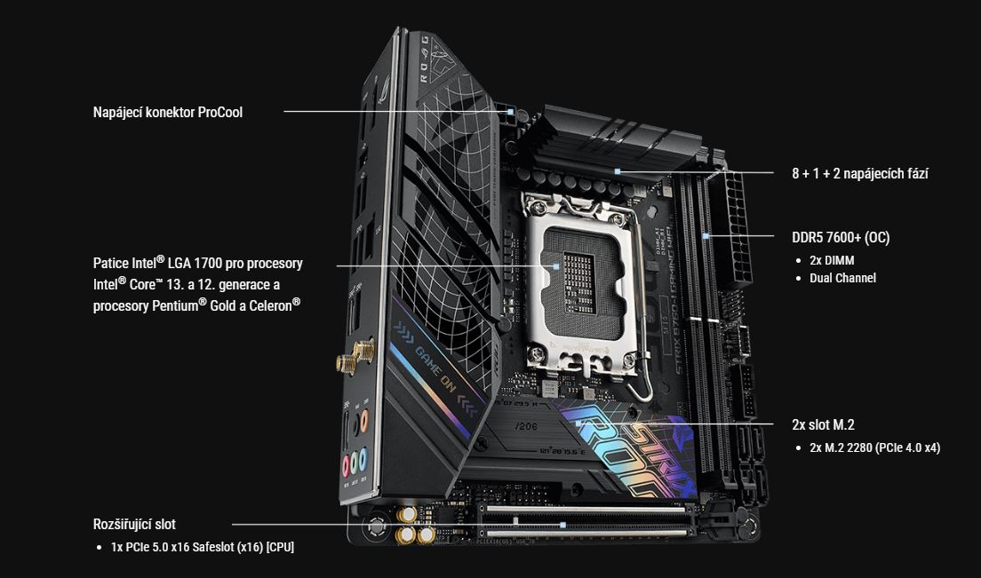 Deska ROG Strix B760-I nedÄ›lá kompromisy u dĹŻleĹľitĂ˝ch vÄ›cĂ. Je vybavena osmi napájecĂmi fázemi a mohutnĂ˝m chladicĂm systĂ©mem, kterĂ˝ vám poskytne veškerou sĂlu procesorĹŻ Raptor Lake. Slot PCIe 5.0 je pĹ™ipraven pro tu nejvĂ˝konnÄ›jšà grafickou kartu, kterou mĹŻĹľete do PC skĹ™ĂnÄ› umĂstit, abyste dosáhli vysokĂ© hodnoty FPS. Sloty pro pamÄ›ti zvládnou závratnĂ© rychlosti DDR5.