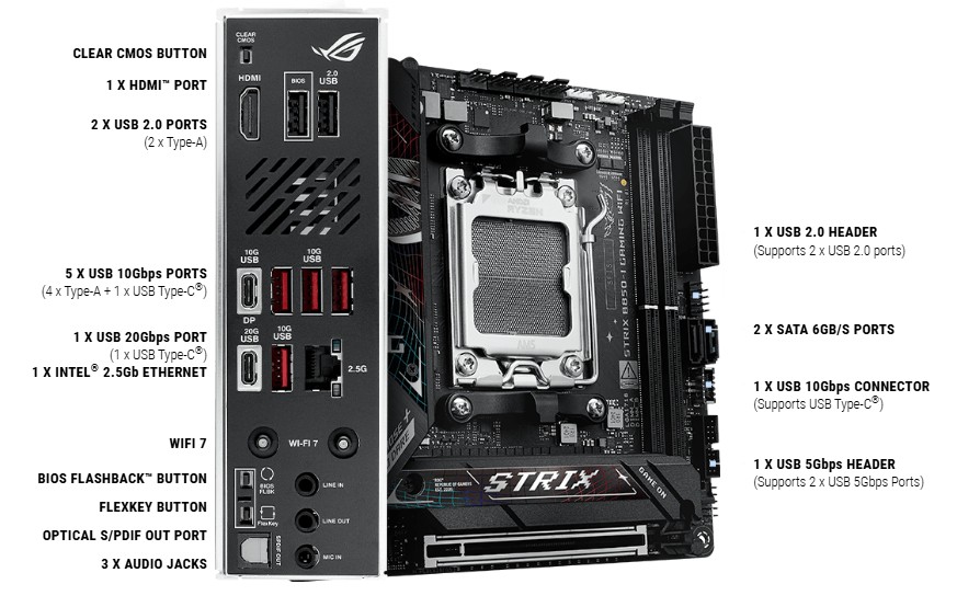 ROG Strix B850-I Gaming WiFi integruje špiÄŤkovĂ© technologie do elegantnĂho provedenĂ mini-ITX. Je vybaven sloty PCIe 5.0 pro grafiku a ĂşloĹľištÄ›, dvoukanálovĂ˝mi sloty DDR5 a robustnĂm napájenĂm pro špiÄŤkovĂ© hry a nároÄŤnĂ© pracovnĂ zatĂĹľenĂ. PokroÄŤilĂ© Ĺ™ešenĂ chlazenĂ mezitĂm udrĹľuje špiÄŤkovĂ˝ vĂ˝kon a WiFi 7 zajišťuje ultrarychlĂ© pĹ™ipojenĂ. Tato platforma poskytuje vĂ˝kon a konektivitu, kterĂ© vyĹľadujĂ pokroÄŤilĂ© aplikace poÄŤĂtaÄŤĹŻ s umÄ›lou inteligencĂ.
