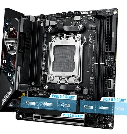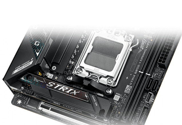 Strix B850-I plnÄ› vyuĹľĂvá novĂ˝ standard a nabĂzĂ komplexnĂ podporu PCIe 5.0. Nejvyššà rozšiĹ™ujĂcĂ slot x16 je pĹ™ipraven na generaci 5 a je chránÄ›n držákem SafeSlot, kterĂ˝ unese hmotnost nejnovÄ›jšĂch grafickĂ˝ch karet. Dva vestavÄ›nĂ© sloty M.2 jsou dĂky rozhranĂ PCIe 5.0 uzpĹŻsobeny pro bleskovĂ© rychlosti ÄŤtenĂ a zápisu 16 Gb/s. Jeden slot M.2 je krytĂ˝ podstatnĂ˝m chladiÄŤem, kterĂ˝ odvádĂ teplo diskĹŻ novĂ© generace.