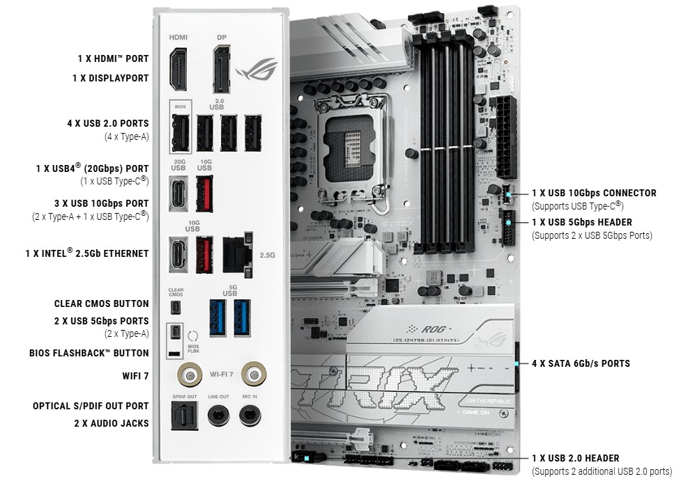 Strix B860-A je vybaven jednĂm portem USB4 (20 Gb/s) pro rychlĂ© datovĂ© pĹ™enosy aĹľ 20 Gb/s.