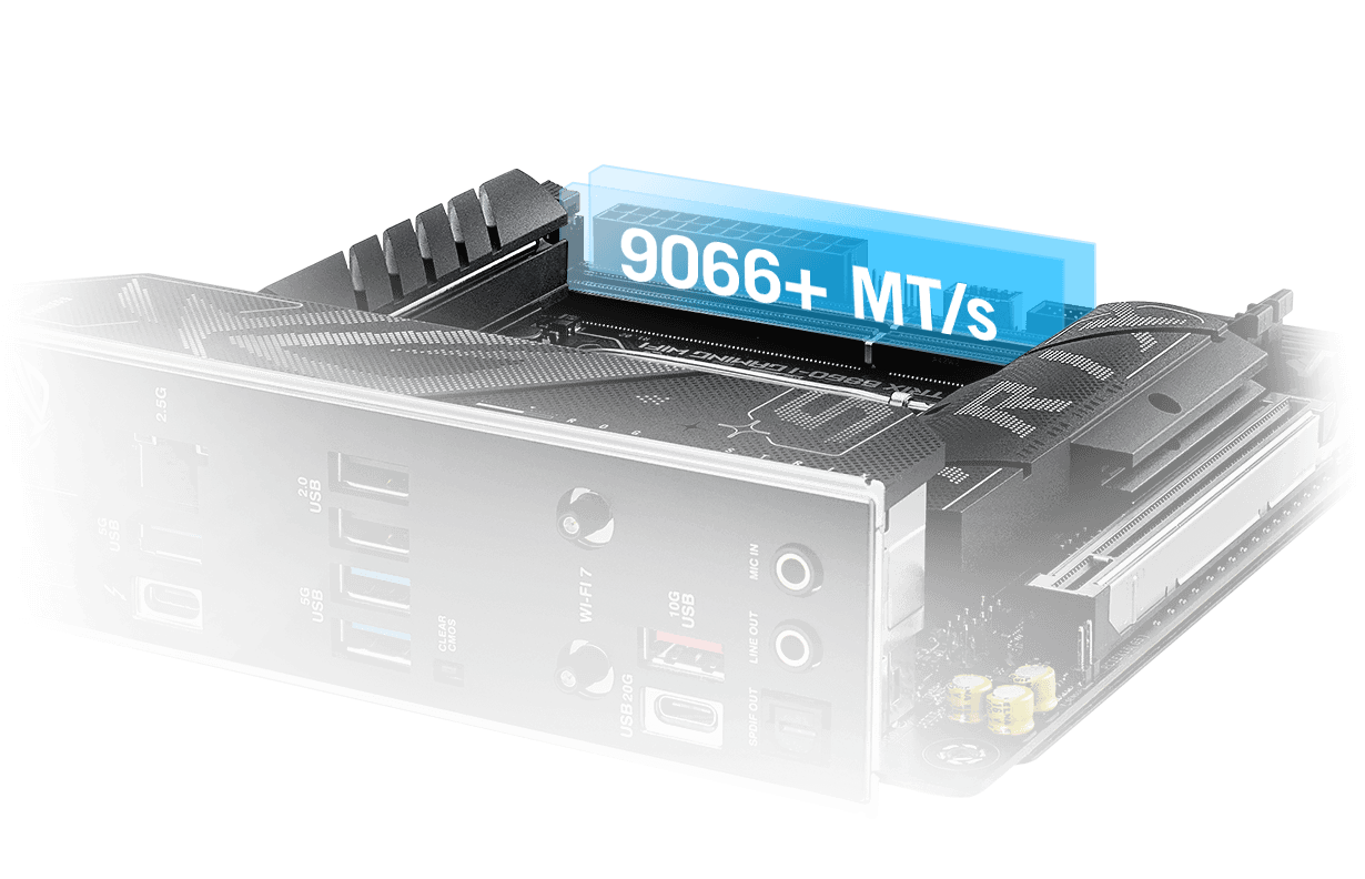 SpoleÄŤnost ROG má bohatou historii poskytovánà špiÄŤkovĂ©ho vĂ˝konu pamÄ›tĂ a DDR5 nenĂ vĂ˝jimkou. VylepšenĂ© smÄ›rovánĂ signálu mĹŻĹľe u modelu Strix B860-I posunout sady pro nadšence daleko za hranici 9 GT/s, pĹ™iÄŤemĹľ na obzoru jsou ještÄ› vyššà rychlosti. ZkušenĂ˝m uĹľivatelĹŻm nabĂzĂ UEFI širokou škálu moĹľnostĂ, jak vyladit a posunout vĂ˝kon aĹľ na hranice moĹľnostĂ.