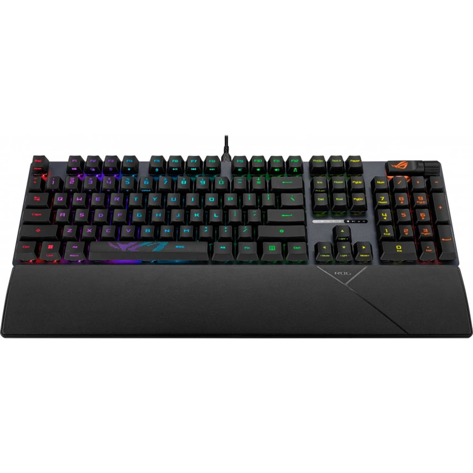 Herní klávesnice ROG Strix Scope II s předem namazanými mechanickými spínači ROG NX Snow a NX Storm, pěnou tlumící zvuk, dvojitými krytkami kláves PBT nebo ABS s UV povlakem, klávesovými zkratkami pro streamování, multifunkčními ovládacími prvky, třemi úhly sklonu a opěrkou zápěstí