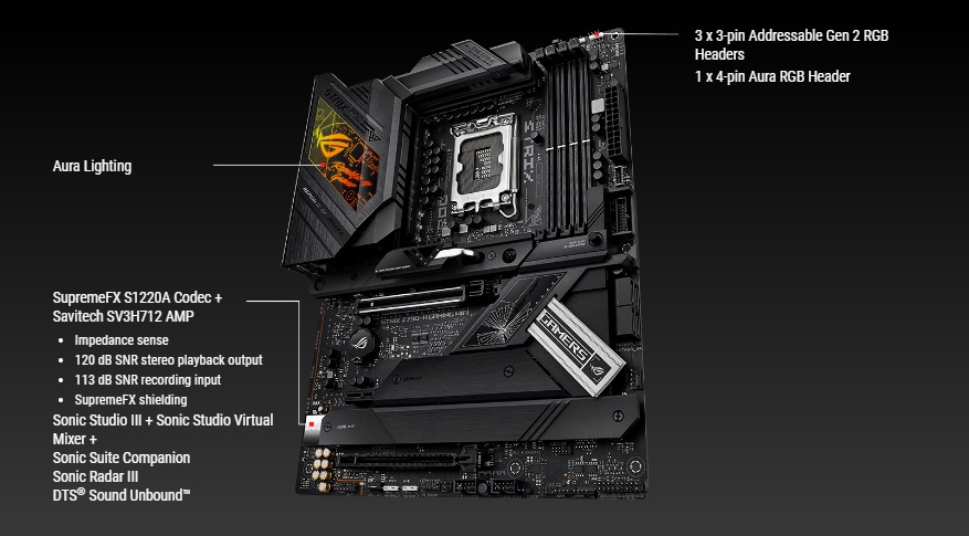 ROG SupremeFX je jedinečná kombinace hardwarových a softwarových technologií, které poskytují vynikající zvuk. Implementace Strix Z790-H je vybavena kodekem S1220A pro přehrávání ve vysokém rozlišení až 32 bitů/192 kHz ve všech kanálech. Výstup z předního panelu je streamován přes integrovaný zesilovač Savitech, který dokáže řídit vysoce věrnou akustiku do široké škály reproduktorů a náhlavních souprav.