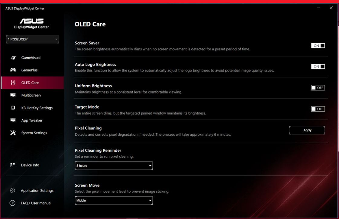 ASUS OLED Care poskytuje včasné připomenutí čištění pixelů, spořič obrazovky, funkci přesunutí obrazovky a další funkce pro ochranu panelu OLED a zajištění dlouhé životnosti obrazovky.