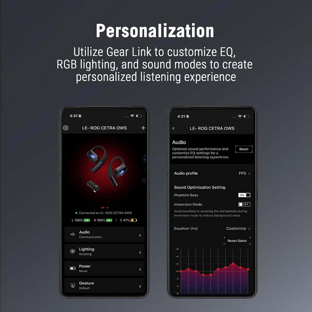- Integrované audio režimy: Režim Phantom Bass posiluje vnímání nízkých frekvencí a režim Immersion jemně snižuje hluk v pozadí pro soustředěnější a pohlcující zážitek z poslechu