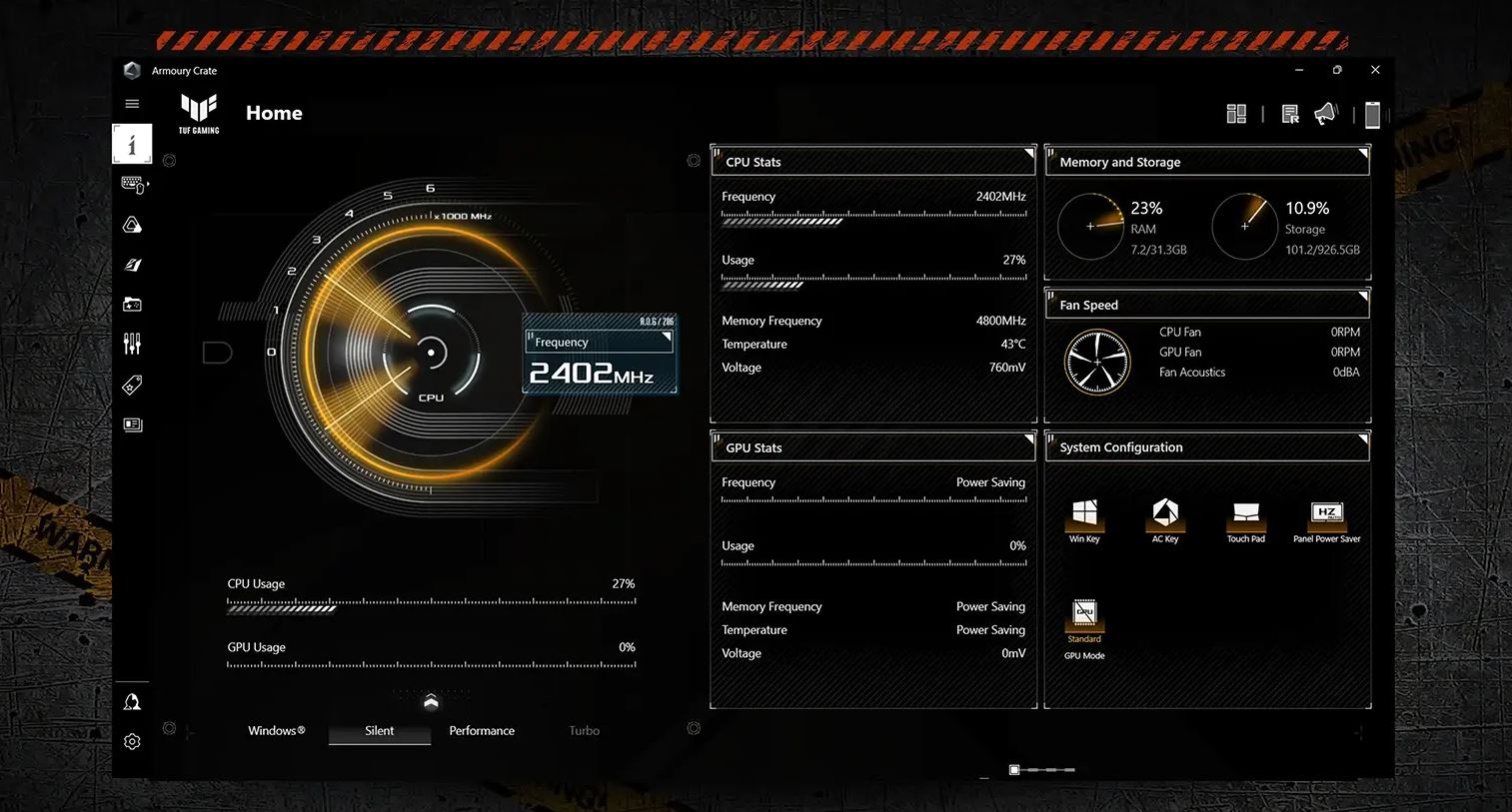 Armoury Crate sjednocuje ovládání systému a osvětlení, abyste měli základní nastavení na dosah ruky v jediném nástroji. Rozsáhlé možnosti přizpůsobení umožňují nastavit si estetické efekty, vyladit herní profily a upravit nastavení zvuku podle vašich preferencí. Pomocí profilů scénářů můžete definovat a přizpůsobit předvolby, které automaticky upraví výkon a další nastavení při spuštění oblíbených aplikací a her. Mějte úplnou kontrolu nad svými zážitky a udělejte si to podle sebe.