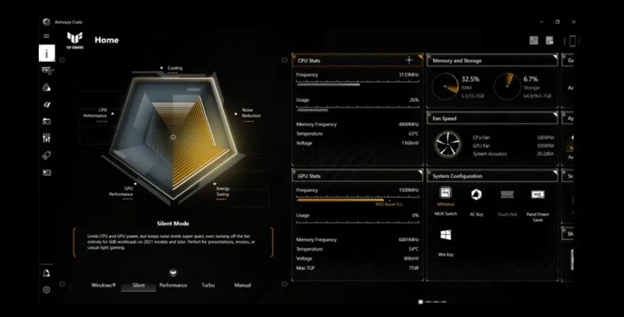 Software Armoury Crate sjednocuje ovládání systému a osvětlení do jediného, snadno použitelného nástroje. Rozsáhlé možnosti přizpůsobení umožňují nastavit si estetické efekty, vyladit herní profily a upravit nastavení zvuku podle vašich preferencí. Pomocí profilů scénářů můžete definovat a přizpůsobit předvolby, které automaticky upraví výkon a další nastavení při spuštění oblíbených aplikací a her. S Armoury Crate máte své zážitky plně pod kontrolou.