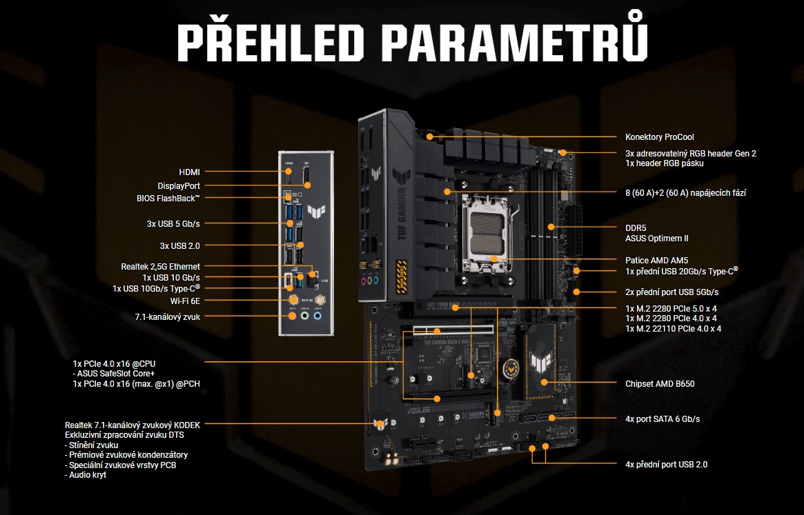 ASUS TUF GAMING B650-E WIFI vyuĹľĂvá všechny vĂ˝hody nejnovÄ›jšà patice AM5 pro desktopovĂ© procesory AMD Ryzen™ a kombinuje je s funkcemi urÄŤenĂ˝mi pro hranĂ her a osvÄ›dÄŤenou odolnostĂ. Tato základnĂ deska je vybavena komponenty vojenskĂ©ho standardu, vylepšenĂ˝m Ĺ™ešenĂm napájenĂ a komplexnĂm systĂ©mem chlazenĂ. PĹ™ekoná vaše oÄŤekávánĂ, protoĹľe nabĂzĂ stabilnĂ vĂ˝kon bÄ›hem hernĂch maratonĹŻ. ZákladnĂ desky TUF GAMING navĂc procházejĂ pĹ™ĂsnĂ˝m testovánĂm odolnosti, aby bylo zajištÄ›no, Ĺľe zvládnou podmĂnky, ve kterĂ˝ch by jinĂ© desky mohly selhat. Z estetickĂ©ho hlediska se tento model vyznaÄŤuje ÄŤernou barvou a geometrickĂ˝mi designovĂ˝mi prvky, kterĂ© reflektujĂ spolehlivost a stabilitu, jeĹľ definujĂ Ĺ™adu TUF GAMING.