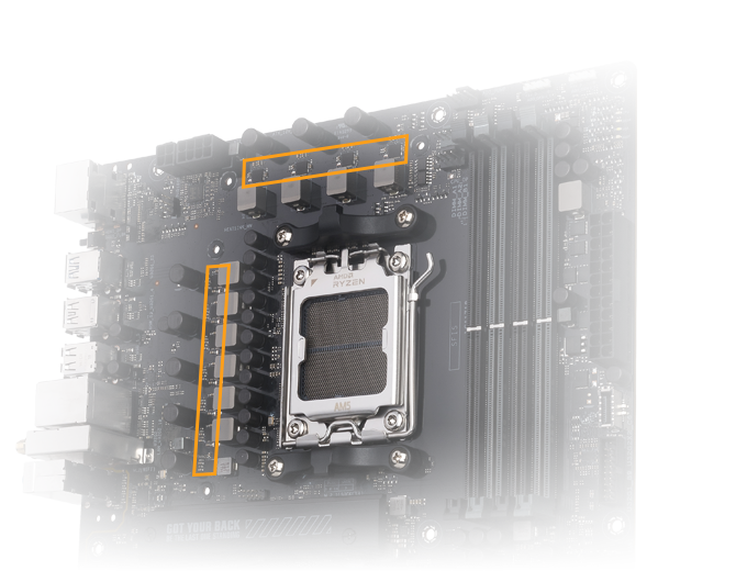 KaĹľdá z 8 (60 A)+2 (60 A) napájecĂch fázĂ je dimenzována na 60 ampĂ©rĹŻ a kombinuje high-side a low-side MOSFETy a ovladaÄŤe v jednom, aby poskytovala napájenĂ, účinnost a stabilnĂ vĂ˝kon všem kompatibilnĂm procesorĹŻm AMD.