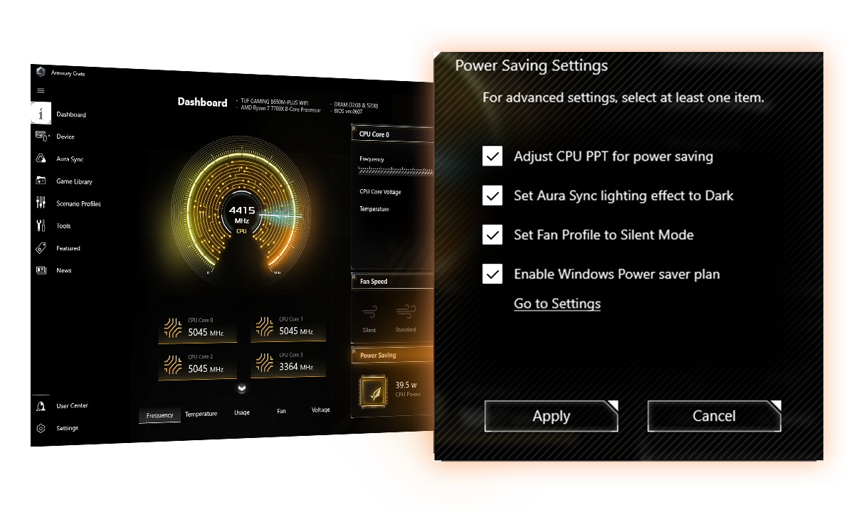Funkce Ăšspora energie obsahuje nÄ›kolik nastavenĂ, pomocĂ kterĂ˝ch lze snadno optimalizovat spotĹ™ebu energie a maximalizovat jejĂ Ăşsporu. MĹŻĹľete povolit omezenĂ vĂ˝konu procesoru, ztmavit osvÄ›tlenĂ Aura a nastavit profil ventilátoru do ĂşspornĂ©ho reĹľimu. MĹŻĹľete takĂ© pĹ™epnout plán Ăşspory energie, kterĂ˝ je integrován do systĂ©mu Microsoft Windows.