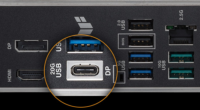 Tato základní deska je vybavena zadním USB 20 Gb/s typu C s režimem DP Alt pro rychlé datové přenosy až 20 Gb/s.