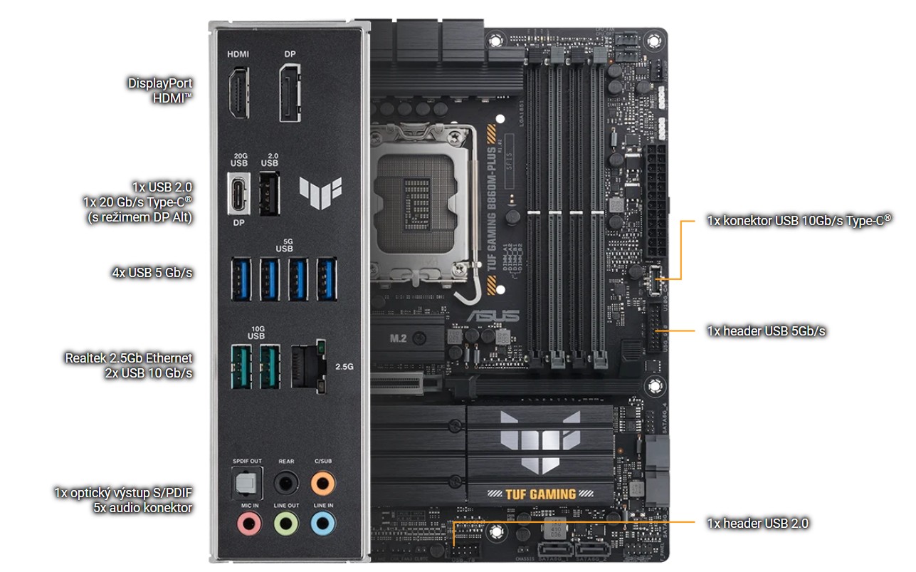 ZákladnĂ deska ASUS TUF GAMING B860M-PLUS vyuĹľĂvá všechny vĂ˝hody nejnovÄ›jšĂch procesorĹŻ Intel Core Ultra (Series 2) a kombinuje je s funkcemi urÄŤenĂ˝mi pro hranĂ her a osvÄ›dÄŤenou odolnostĂ. Tato základnĂ deska je vybavena komponenty vojenskĂ©ho standardu, vylepšenĂ˝m Ĺ™ešenĂm napájenĂ a komplexnĂm systĂ©mem chlazenĂ. PĹ™ekoná vaše oÄŤekávánĂ, protoĹľe nabĂzĂ stabilnĂ vĂ˝kon bÄ›hem hernĂch maratonĹŻ. ZákladnĂ desky TUF GAMING navĂc procházejĂ pĹ™ĂsnĂ˝m testovánĂm odolnosti, aby bylo zajištÄ›no, Ĺľe zvládnou podmĂnky, ve kterĂ˝ch by jinĂ© desky mohly selhat. Tato platforma poskytuje vĂ˝kon a konektivitu, kterĂ© vyĹľadujĂ pokroÄŤilĂ© AI PC aplikace.