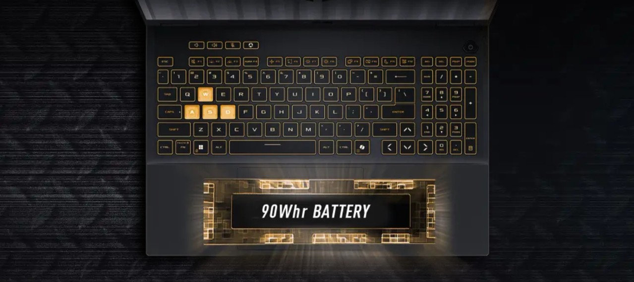 Designová filozofie notebooku TUF Gaming F16 si zakládá na kombinaci výkonu a mobility. F16 se snadno vejde do většiny tašek, batohů a dokonce i do některých velkých kabelek. Zásluhou hmotnosti necelých 2,3 kg a tloušťce 17,9 mm v nejtenčím bodě ho můžete snadno uchopit a vzít kamkoli s sebou. Baterie s kapacitou 90 Wh vám zajistí delší výdrž. Ve spojení se 100W nabíjením přes USB-C to nikdy nebylo jednodušší.