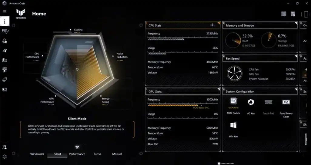Software Armoury Crate sjednocuje ovládání systému a osvětlení do jediného, snadno použitelného nástroje. Rozsáhlé možnosti přizpůsobení umožňují nastavit si estetické efekty, vyladit herní profily a upravit nastavení zvuku podle vašich preferencí. Pomocí profilů scénářů můžete definovat a přizpůsobit předvolby, které automaticky upraví výkon a další nastavení při spuštění oblíbených aplikací a her. S Armoury Crate máte své zážitky plně pod kontrolou.