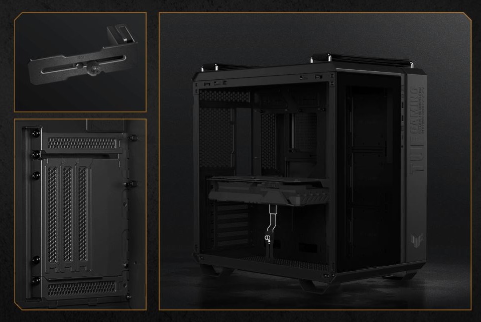 TUF Gaming GT502 PLUS pokračuje v optimalizacích pro stavitele díky bočním panelům, které lze jednoduše odejmout stisknutím tlačítka skrytého na zadní straně šasi.