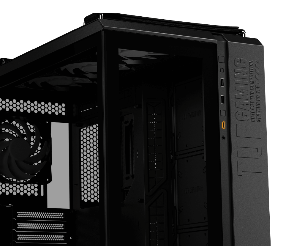 Kromě dvou portů USB-A je přední panel skříně TUF Gaming GT502 PLUS je vybaven portem USB 3.2 Gen 2 Type-C, který je vhodný pro přenosové rychlosti až 10 Gb/s.