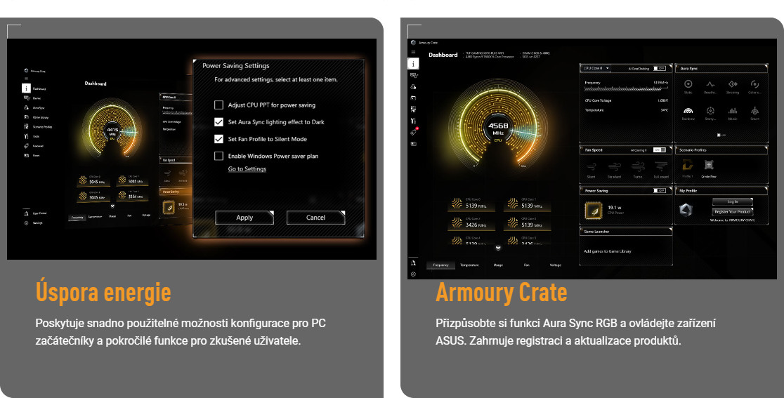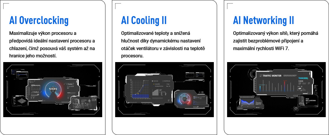Řešení ASUS AI – včetně AI Overclocking, AI Cooling II pro řízení teploty a AI Networking II pro optimalizaci šířky pásma v reálném čase – nabízejí inteligentní přetaktování, účinné chlazení a novou úroveň ultrarychlého připojení.