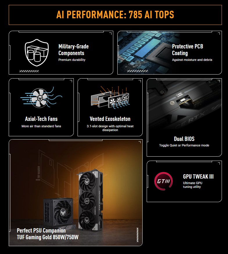 Tato pokročilá konstrukce chlazení je vybavena exkluzivní výrobní technikou MaxContact společnosti ASUS a účinnými ventilátory Axial-tech, které pomáhají zajistit špičkový tepelný výkon, optimalizované proudění vzduchu a tichý provoz, to vše v robustním a odvětraném kovovém vnějším skeletu.