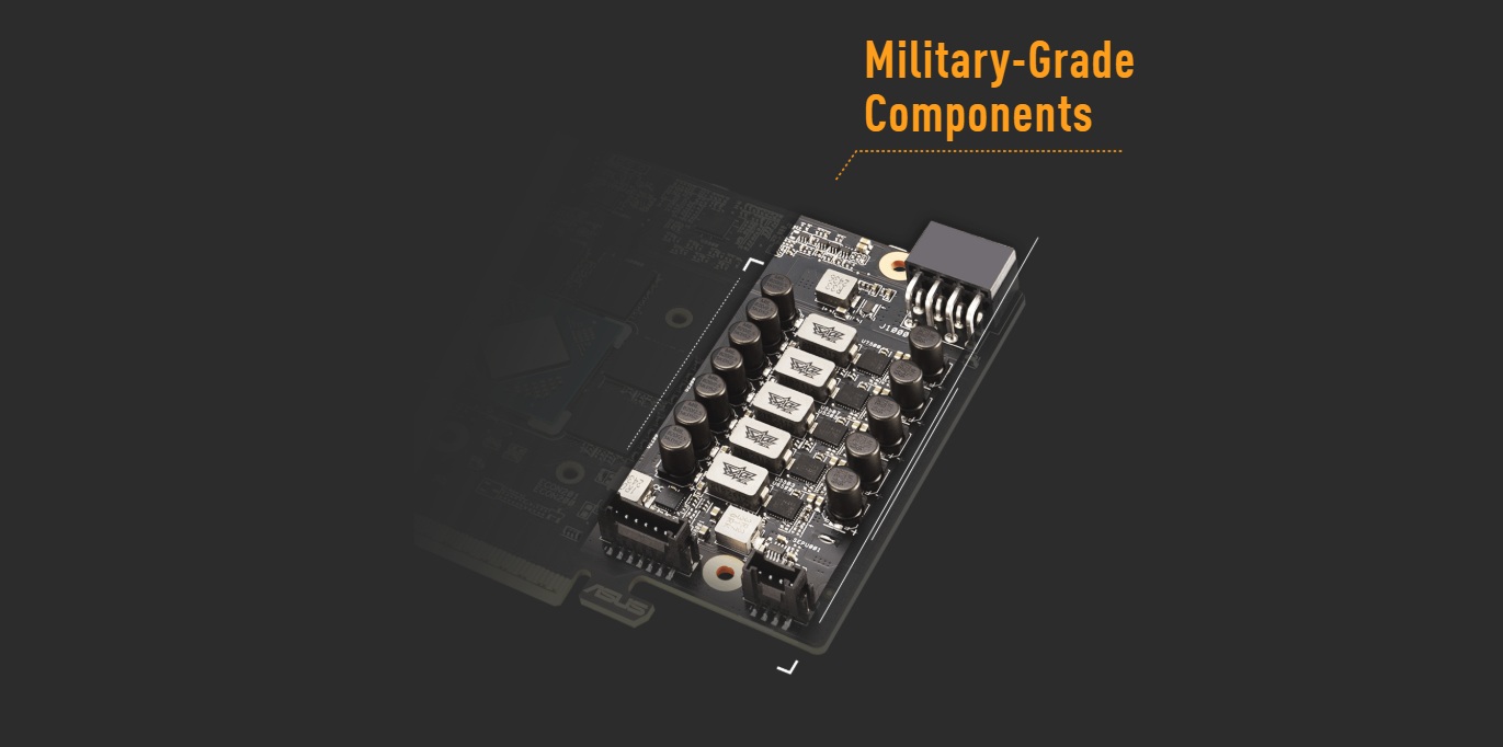 CertifikovanĂ© TUF tlumivky a MOSFETy vojenskĂ© kvality dodávajĂ GPU stabilnĂ napájenĂ, coĹľ pomáhá zlepšit stabilitu systĂ©mu. ÄŚernĂ© kovovĂ© kondenzátory TUF 5K poskytujĂ o 52 % širšà teplotnĂ toleranci a 2,5krát delšà životnost neĹľ standardnĂ kondenzátory.