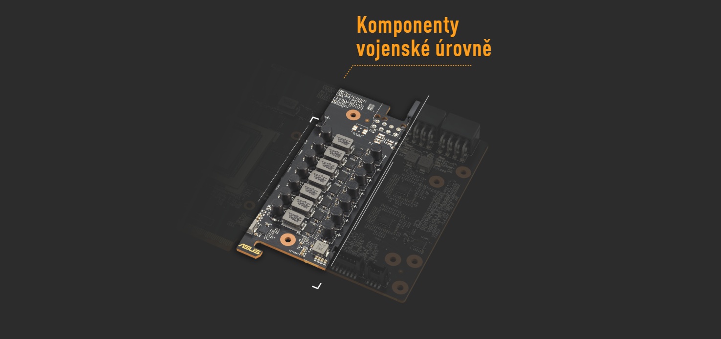 CertifikovanĂ© cĂvky TUF vojenskĂ©ho standardu a MOSFETy dodávajĂ GPU robustnĂ napájenĂ, coĹľ pomáhá zlepšit stabilitu systĂ©mu. ÄŚernĂ© metalickĂ© kondenzátory TUF 5K poskytujĂ o 52 % vyššà teplotnĂ toleranci a 2,5krát delšà životnost neĹľ standardnĂ kondenzátory.