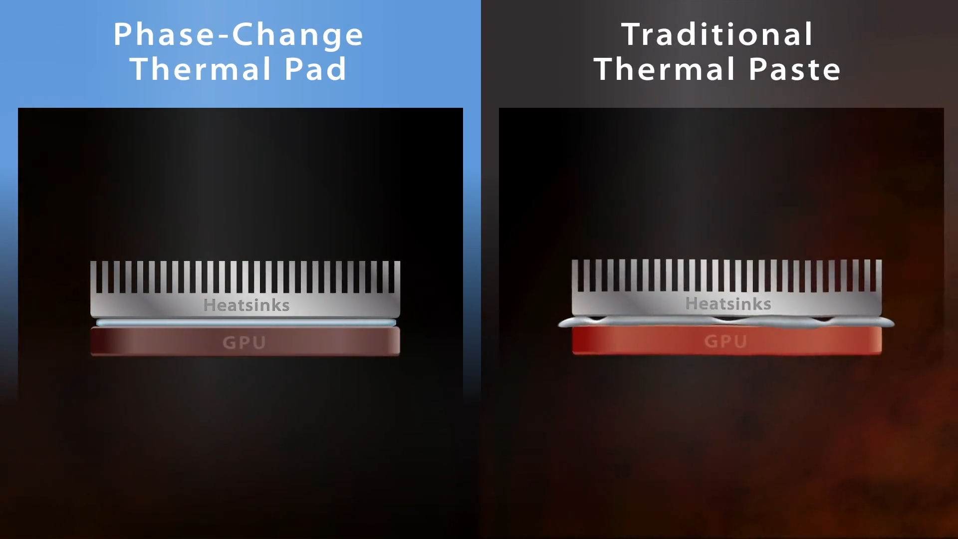 PrĂ©miová tepelná podloĹľka GPU s fázovĂ˝m pĹ™echodem, která se rozpustĂ a účinnÄ› tĂm vyplnĂ mezery mezi GPU a chladicĂm modulem, poskytuje vynikajĂcĂ tepelnou vodivost a lepšà odvod tepla. DĂky tomu zajišťuje optimálnĂ vĂ˝kon a dlouhou Ĺľivotnost grafickĂ˝ch karet pĹ™i vysokĂ©m zatĂĹľenĂ.