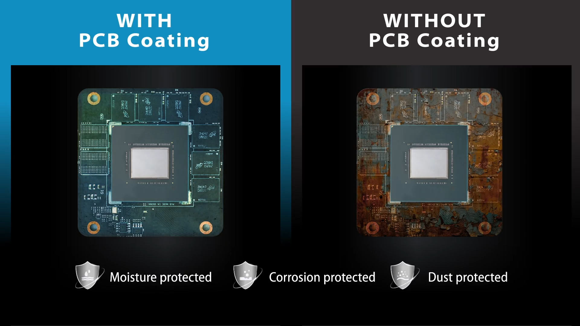 Deska s plošnĂ˝mi spoji je opatĹ™ena ochrannou konformnĂ vrstvou, která ji pomáhá chránit pĹ™ed zkraty zpĹŻsobenĂ˝mi vlhkostĂ, prachem nebo neÄŤistotami.