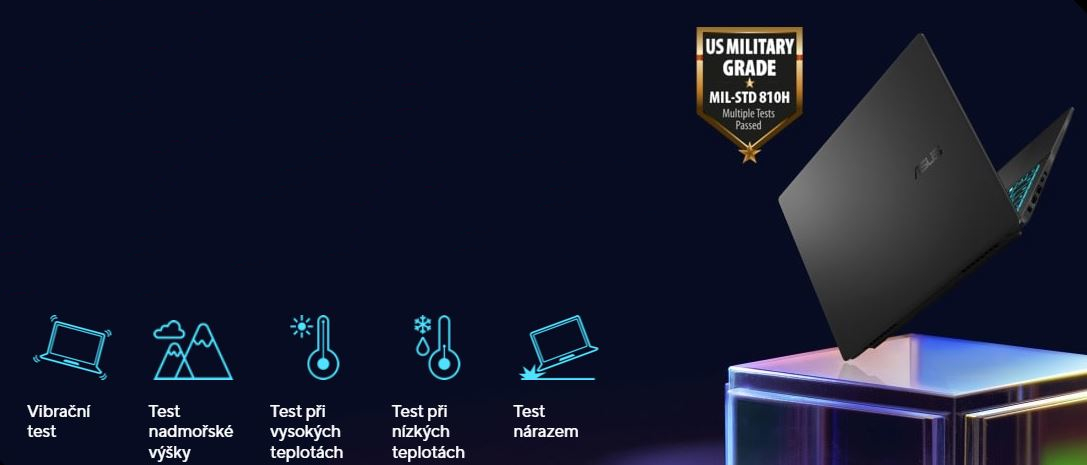 SpotĹ™ebitelskĂ© notebooky ASUS splĹujĂ mimořádnÄ› nároÄŤnĂ˝ vojenskĂ˝ standard MIL-STD 810H20, kterĂ˝ garantuje spolehlivost a odolnost. ProcházejĂ nároÄŤnĂ˝m testovacĂm reĹľimem, kterĂ˝ zahrnuje rozšĂĹ™enĂ© testy provozu v extrĂ©mnĂch podmĂnkách. Tyto faktory takĂ© prospĂvajĂ dlouhĂ© Ĺľivotnosti notebookĹŻ, a tĂm i udrĹľitelnosti, takĹľe mĹŻĹľete pracovat, cestovat nebo odpoÄŤĂvat s jistotou, Ĺľe váš notebook ASUS je pĹ™ipraven na skuteÄŤnĂ˝ svÄ›t - dnes i v dalšĂch letech.