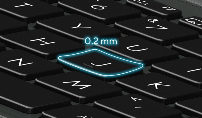 0,2mm prohnutí kláves je navrženo tak, aby odpovídalo tvaru konečků prstů. Vaše prsty jsou jemně vedeny do ideálního místa kontaktu s klávesami.