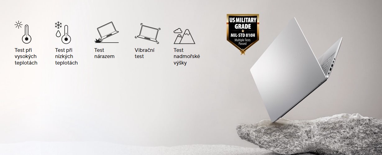 Spotřebitelské notebooky ASUS splňují mimořádně náročný vojenský standard MIL-STD 810H, který garantuje spolehlivost a odolnost. Procházejí náročným testovacím režimem, který zahrnuje rozšířené testy pro provoz v extrémních podmínkách. Tyto faktory také prospívají dlouhé životnosti notebooků, a tím i udržitelnosti, takže můžete pracovat, cestovat nebo odpočívat s jistotou, že váš notebook ASUS je připraven na skutečný svět - dnes i v dalších letech.