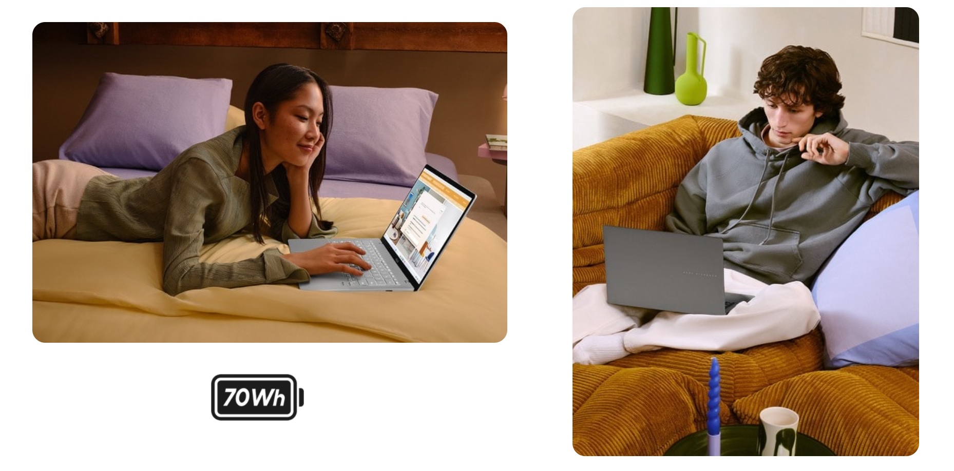 S notebookem ASUS Vivobook S16 se nemusíte bát, že se vám vybije baterie! Jeho 70Wh vysokokapacitní baterie nabízí celodenní výdrž pro bezproblémový multitasking a zábavu. Postará se o to, aby měl váš notebook dostatek energie a byl připraven od úsvitu do soumraku na cokoli.