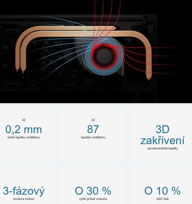 KaĹľdĂ˝ model novĂ© Ĺ™ady Vivobook poskytuje vĂ˝jimeÄŤnĂ˝ odvod tepla prostĹ™ednictvĂm dvou vylepšenĂ˝ch teplovodivĂ˝ch trubic a novĂ©ho ventilátoru IceBlades, kterĂ˝ účinnÄ› urychluje pĹ™enos tepla. Ventilátor IceBlades s 87 lopatkami je vyroben z polymeru z tekutĂ˝ch krystalĹŻ, dĂky ÄŤemuĹľ je lehÄŤĂ a tenÄŤĂ neĹľ běžnĂ© ventilátory. KaĹľdá lopatka ventilátoru IceBlades má 3D zakĹ™ivenĂ˝ aerodynamickĂ˝ design, dĂky nÄ›muĹľ ventilátor dosahuje vyššĂho prĹŻtoku vzduchu a nižšà hluÄŤnosti. KromÄ› toho ventilátory IceBlades vyuĹľĂvajĂ takĂ© fluidnÄ›-dynamickĂ© loĹľisko, dĂky nÄ›muĹľ lze ve srovnánĂ s běžnĂ˝mi ventilátory dosáhnout snĂĹľenĂ vibracĂ a nižšà hluÄŤnosti.