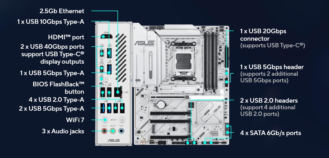 ZákladnĂ deska Ĺ™ady X870 nabĂzĂ všestrannĂ© moĹľnosti pĹ™ipojenĂ, vÄŤetnÄ› podpory WiFi 7, PCIe 5.0, 2,5Gb Ethernetu Realtek a Ĺ™ady portĹŻ USB.