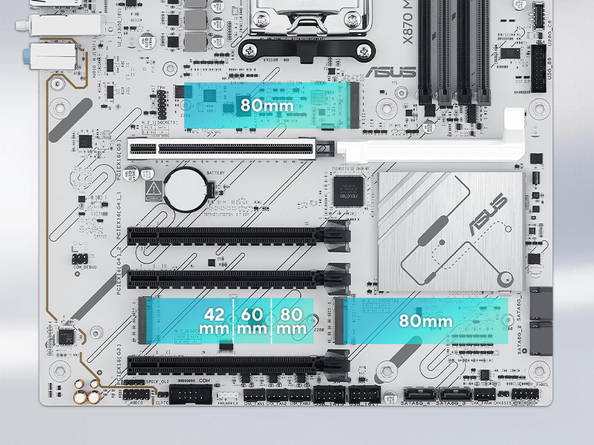X870 MAX GAMING WIFI7 W nabĂzĂ celkem tĹ™i sloty M.2, z nichĹľ jeden podporuje pĹ™enos dat rychlostĂ aĹľ 128 Gb/s prostĹ™ednictvĂm PCIe 5.0 a dva 64 Gb/s prostĹ™ednictvĂm PCIe 4.0. To umoĹľĹuje rychlejšà spouštÄ›nĂ a naÄŤĂtánĂ aplikacĂ s operaÄŤnĂm systĂ©mem nebo aplikaÄŤnĂmi drivery.