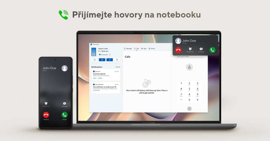 Jednoduše pĹ™ijĂmejte hovory, spravujte oznámenĂ a pĹ™enášejte soubory pĹ™Ămo z jedinĂ©ho zaĹ™ĂzenĂ, vašeho Zenbooku A14. Telefon mĹŻĹľete snadno pouĹľĂvat jako webovou kameru.