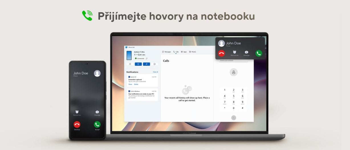 Jednoduše přijímejte hovory, spravujte oznámení a přenášejte soubory přímo z jediného zařízení, vašeho Zenbooku A14. Telefon můžete snadno používat jako webovou kameru.